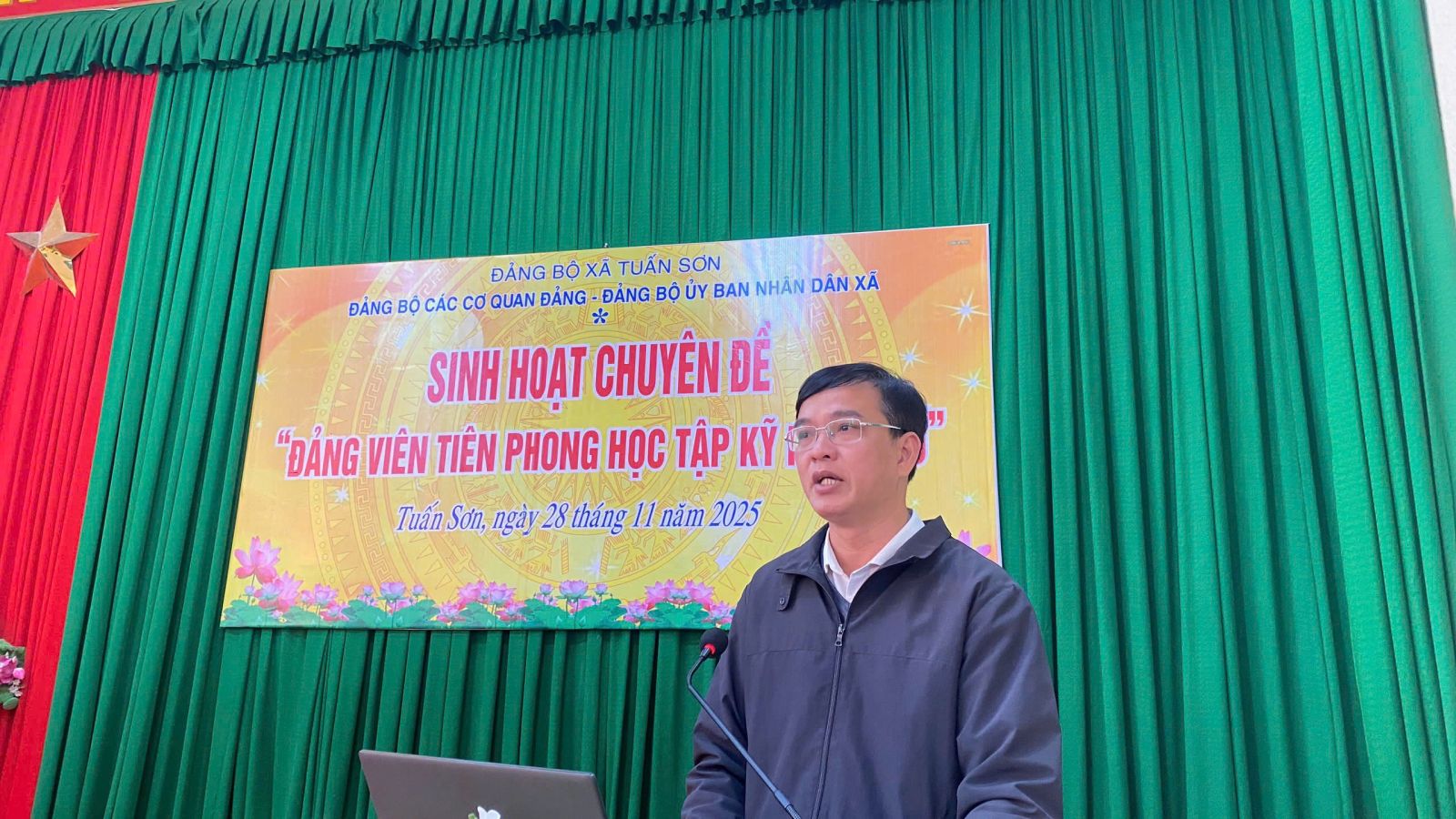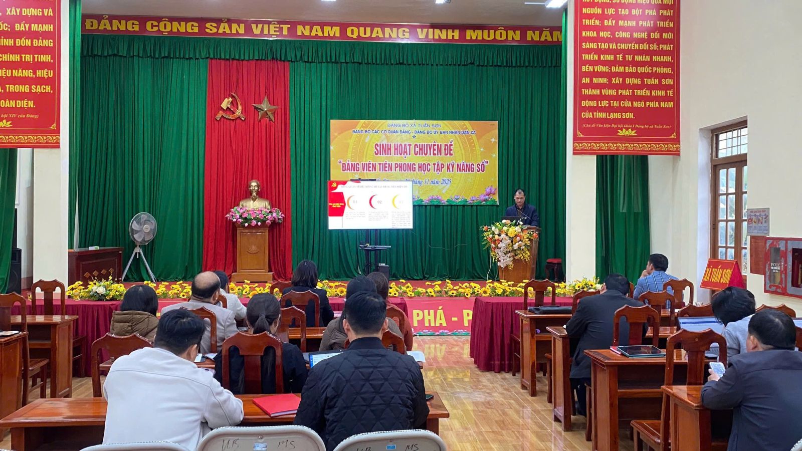 Thực hiện Hướng dẫn số 05-HD/BTGDVTU ngày 21/10/2025 về tổ chức sinh hoạt chuyên đề “Đảng viên tiên phong học tập kỹ năng số”. Chiều ngày 28/11/2025, Đảng bộ Các cơ quan Đảng và Đảng bộ Ủy ban nhân dân xã Tuấn Sơn phối hợp tổ chức buổi sinh hoạt chuyên đề “Đảng viên tiên phong học tập kỹ năng số”. Dự buổi sinh hoạt có đồng chí Đỗ Văn Quyền, Phó Bí thư Thường trực Đảng ủy xã; đồng chí Hoàng Minh Phúc, Phó Bí thư Đảng ủy, Chủ tịch UBND xã cùng toàn thể các đồng chí là cán bộ, đảng viên của các chi bộ trực thuộc 2 đảng bộ.