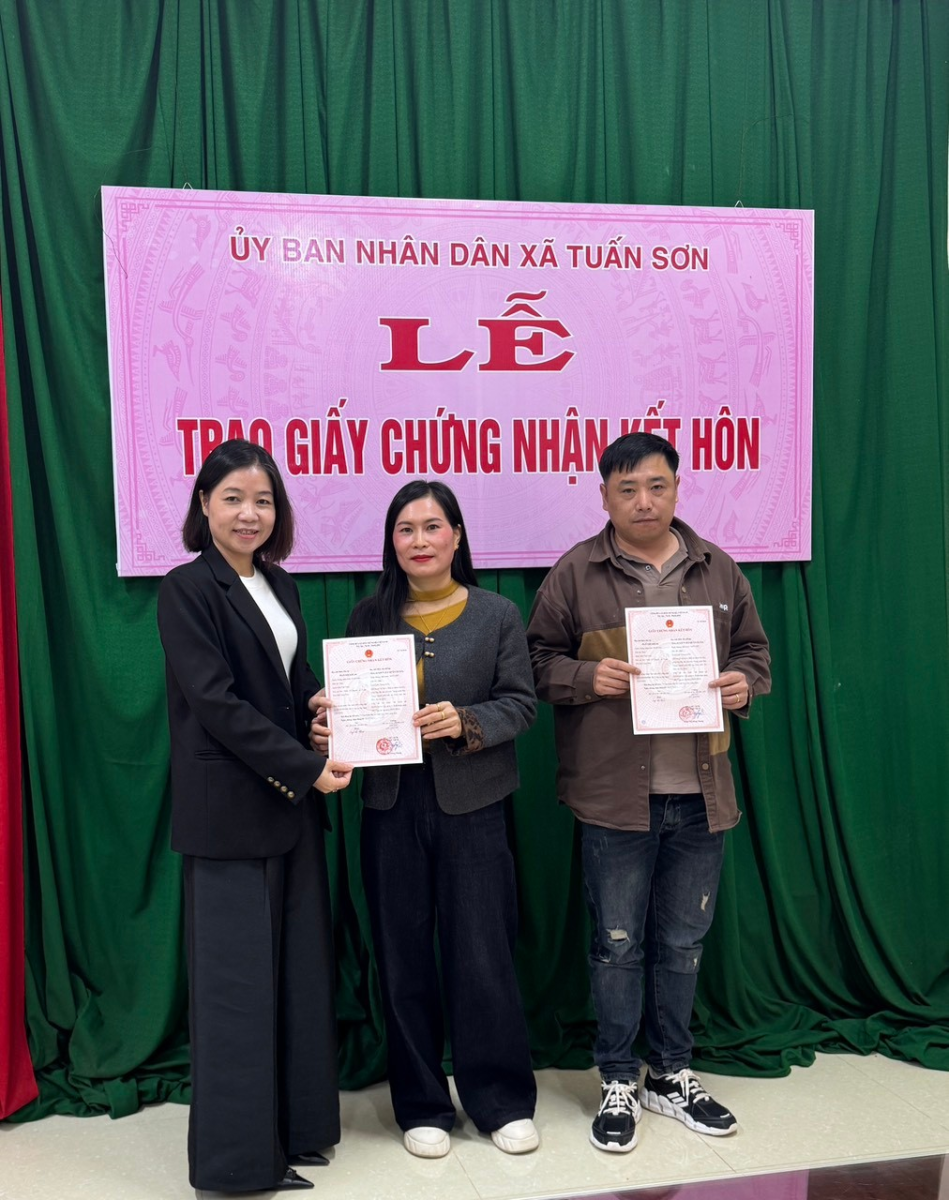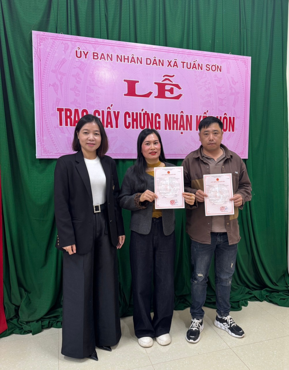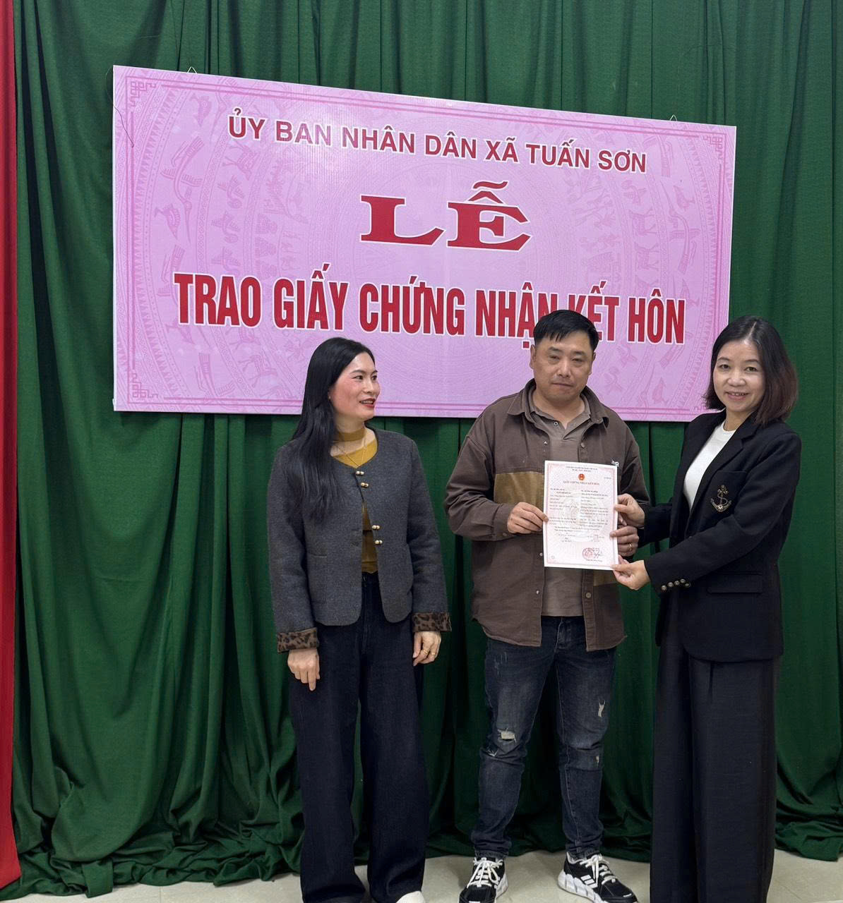 Ngày 27/11/2025, UBND xã Tuấn Sơn tổ chức Lễ Trao giấy chứng nhận kết hôn cho vợ chồng chị Ngô Thị Khảm sinh năm 1982; nơi cư trú: thôn Cã Ngoài, xã Tuấn Sơn, tỉnh Lạng Sơn và anh XIA, JUN JUN, sinh năm 1987, quốc tịch Trung Quốc. Tại buổi lễ, trước sự chứng kiến của Lãnh đạo UBND xã, công chức Văn Phòng HĐND&UBND xã, Trung tâm phục vụ hành chính công xã và người thân gia đình của vợ chồng. Hai vợ, chồng tự nguyện ký vào Sổ đăng ký kết hôn và Giấy chứng nhận kết hôn theo đúng thủ tục pháp luật quy định.