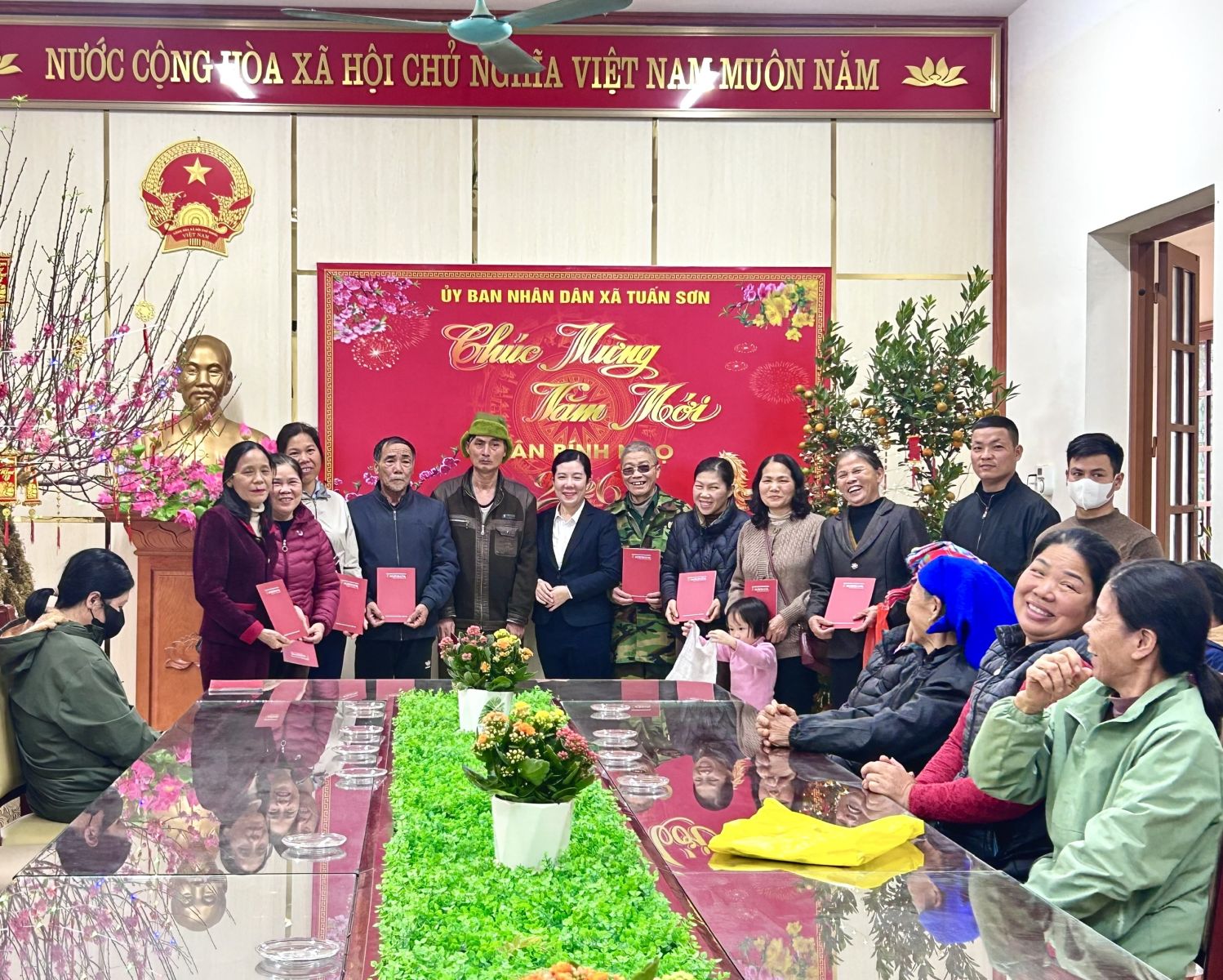 UBND trích kinh phí từ nguồn các cơ quan, đơn vị, các nhà hảo tâm ủng hộ Chương trình “Tết nhân ái” của xã tặng 63 xuất quà cho đối tượng bảo trợ xã hội, gia đình có hoàn cảnh khó khăn chưa được nhận quà Tết từ những nguồn khác.