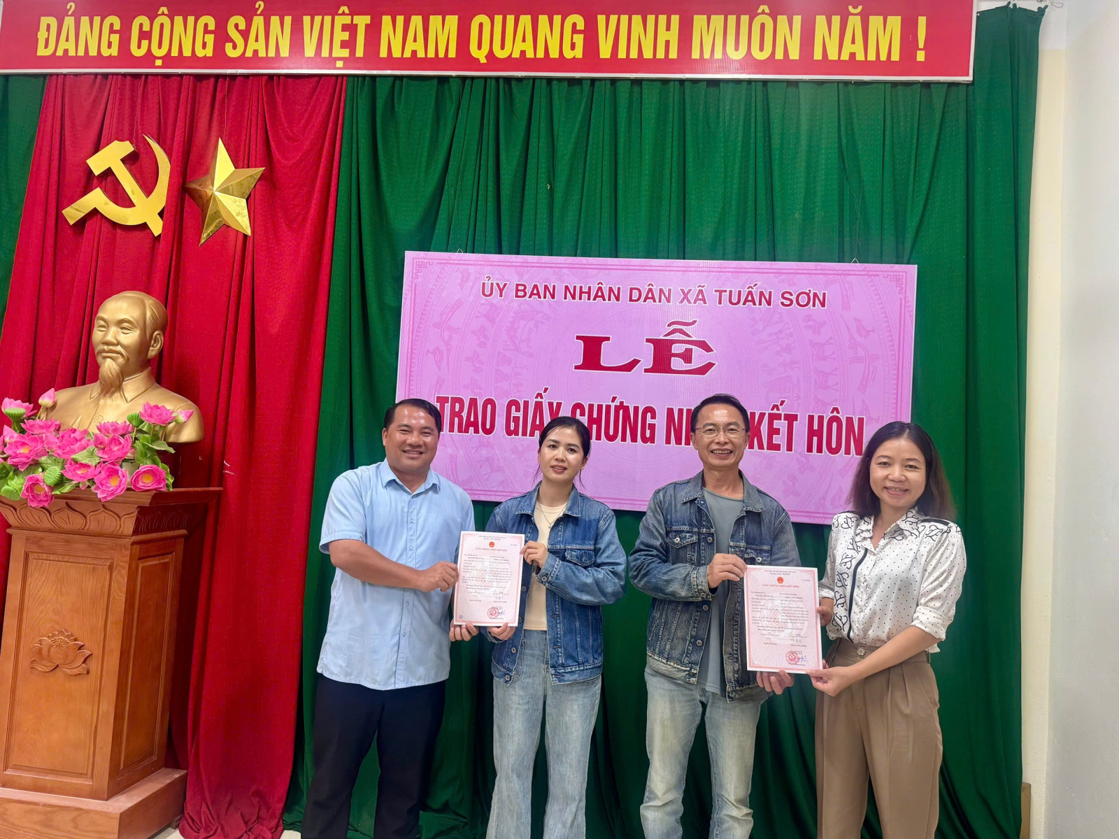 Ngày 13/10/2025, UBND xã Tuấn Sơn tổ chức Lễ Trao giấy chứng nhận kết hôn cho vợ chồng chị Nguyễn Thị Trang sinh năm 1990; nơi cư trú: thôn Voi Xô, xã Tuấn Sơn, tỉnh Lạng Sơn và anh CHEN LIEN CHIEH, sinh năm 1973, quốc tịch Trung Quốc (Đài Loan). Tại buổi lễ, trước sự chứng kiến của Đồng chí Hoàng Minh Phúc, Phó bí thư Đảng uỷ, Chủ tịch UBND và Đồng chí Triệu Thị Hồng Nhung, Phó Chủ tịch UBND xã Tuấn Sơn, Công chức Văn Phòng HĐND&UBND, Trung tâm phục vụ hành chính công xã và người thân gia đình của vợ chồng. Hai vợ, chồng tự nguyện ký vào Sổ đăng ký kết hôn và Giấy chứng nhận kết hôn theo đúng thủ tục pháp luật quy định.